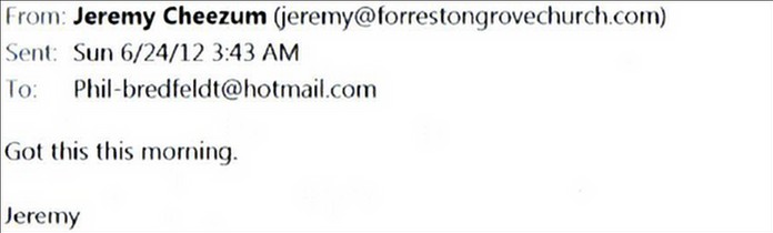 Rev.” Cheezum, to whom I had made the lengthiest and most urgent appeals for relief, simply passed my disregarded emails along to his brother-in-law, Phil, after whom one of Cheezum’s four children may be named. Emails between Cheezum and other PCA pastors would be introduced into evidence given against me in a 2013 lawsuit that unlawfully denied me the right to even talk about the matter, at all, which had of course been the aim of the prosecutions from the start. What may not be said need not be accounted for to God, to the church, or to anyone.