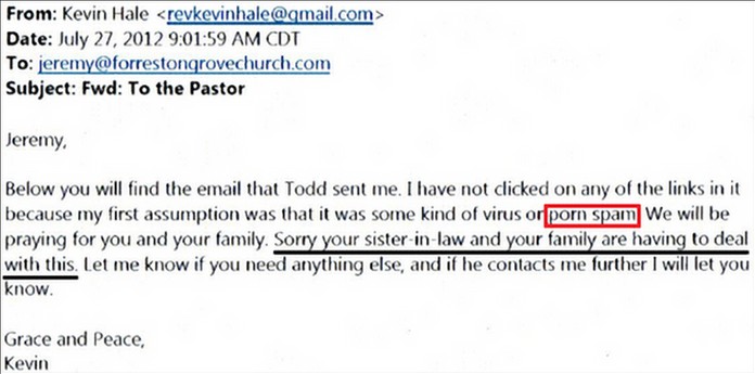 “Rev.” Cheezum seems to have stage-managed the narrative among his fellow pastors. He’s a very ingenuous speaker. “Rev.” Kevin Hale, one of Cheezum’s church brethren, spurned an email I sent him as potential “porn spam,” because it contained hyperlinks to court documents. What he would have perceived had he followed the links should have struck him as far dirtier than pictures of bare skin.