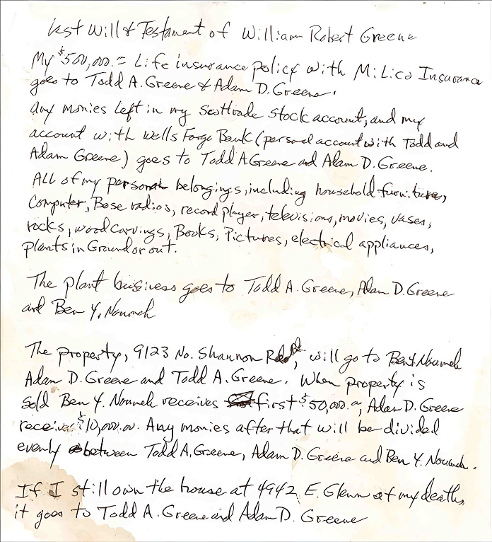 Below is a hand-written last will and testament I found among my dad’s papers when I vainly tried to recover his home from foreclosure as he lay on his deathbed. By the time anyone knew, a life insurance policy meant to provide security for my brother and me, a policy that my father had religiously made payments on for decades, had lapsed, and my dad’s home and the surrounding land were weeks away from being seized by the bank, because he hadn’t been paying his mortgage premiums.