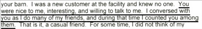 Mine is this: For months, a Ph.D. student named Tiffany—she was careful not to use her last name—hung around my house at night, sometimes until the wee hours, and came on to me while representing herself as a single woman living alone with a dog. She boarded her dressage horse in a stable adjacent to my yard in the stall closest to where I went in and out. By day, the woman cozied up to my mother who was then in treatment for breast cancer. She and I became friends, and there was an unspoken expectation that I should meet her when I was home and she was around. We frequently talked half of the night away. I took her sexual taunts and the excuses she found to grasp or hold my hand at face value. Then she abruptly disappeared and began lying about the nature of our “interaction” when I learned her telephone number belonged to a man named Phil and tried to make sense of it all.